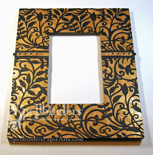 I used two tags to cover the seam. I cut/embossed 2 from black cardstock and 2 from gold Twist paper that I had colored the same as the frame. I marked, made holes and inserted micro brads in the gold piece. I placed one brad in one end of each tag (the other end will be cut off). I applied ½" Scor-Tape® to the back of the black tag. Then I placed the gold piece in place.